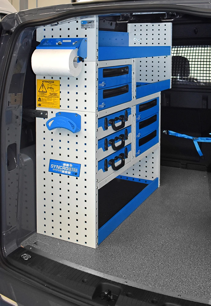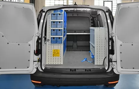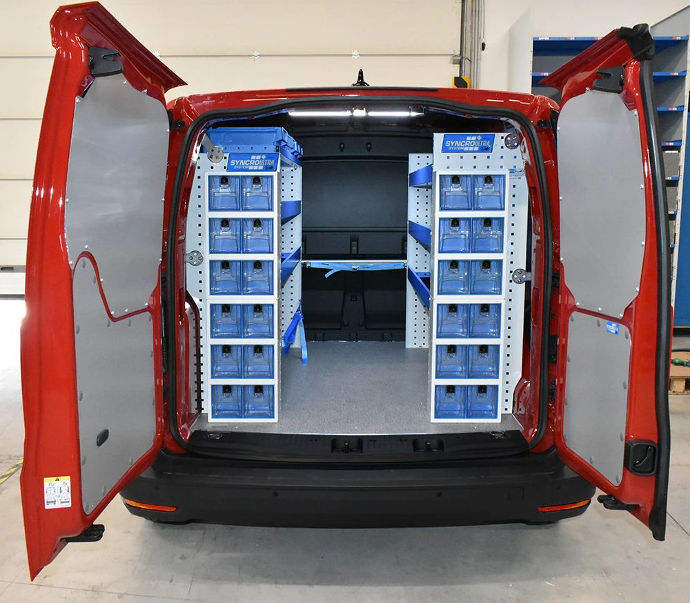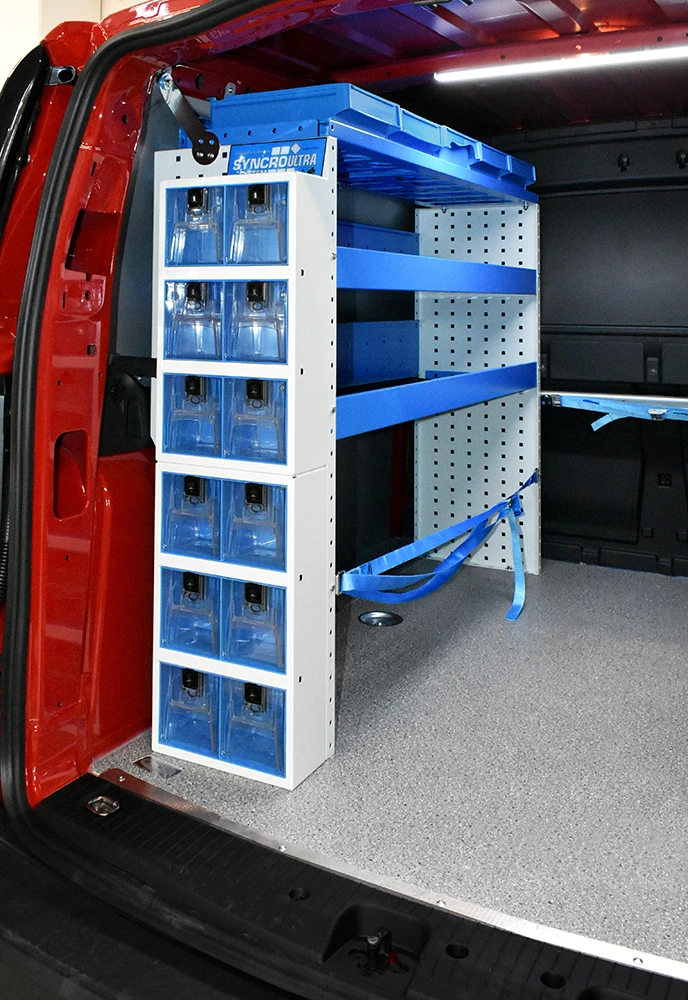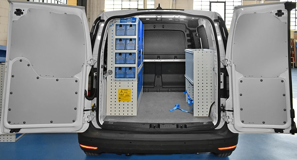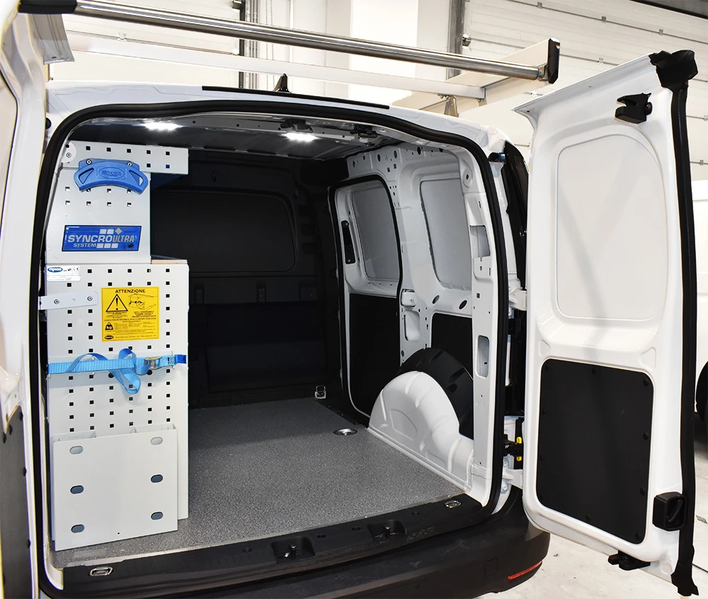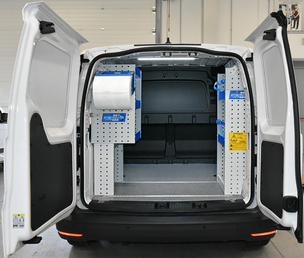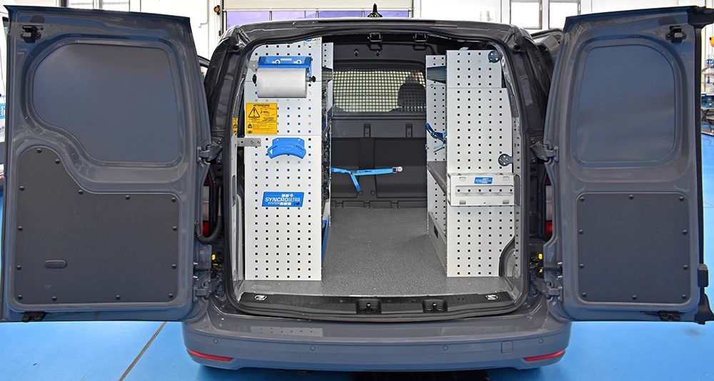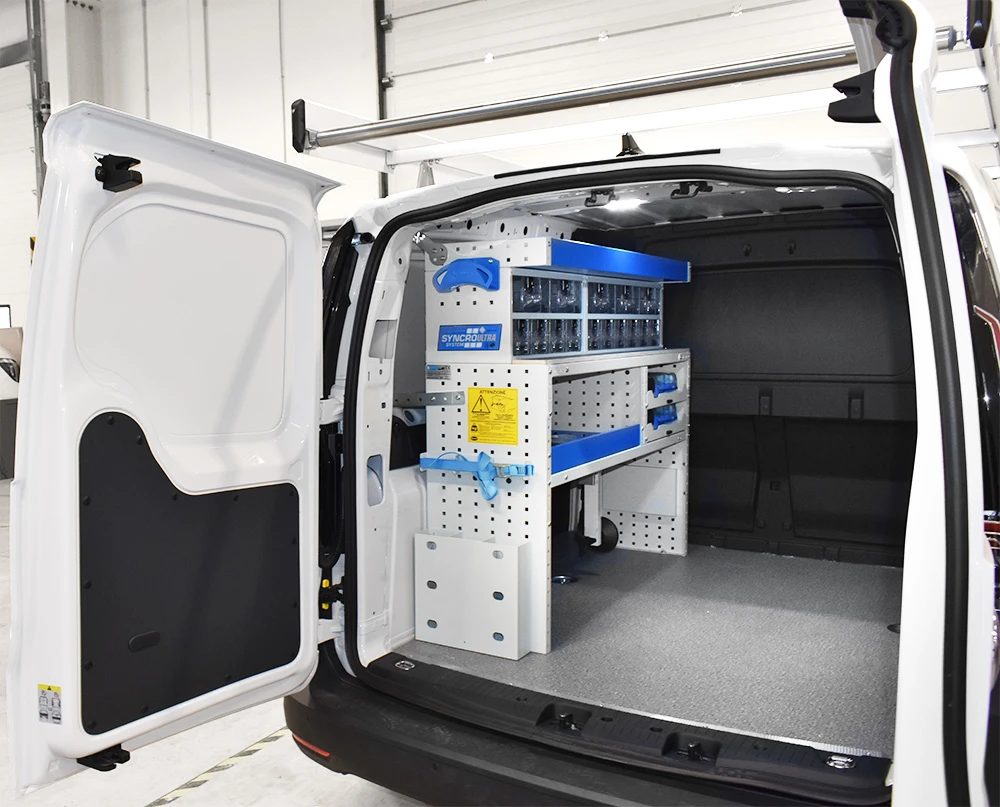 Cu solutia sistemului Syncro pentru Volkswagen Caddy va veti maximiza capacitatea de marfuri transportate in timp ce toate rafturile, unitatile si trusele de scule vor ramane ordonate si usor accesibile.