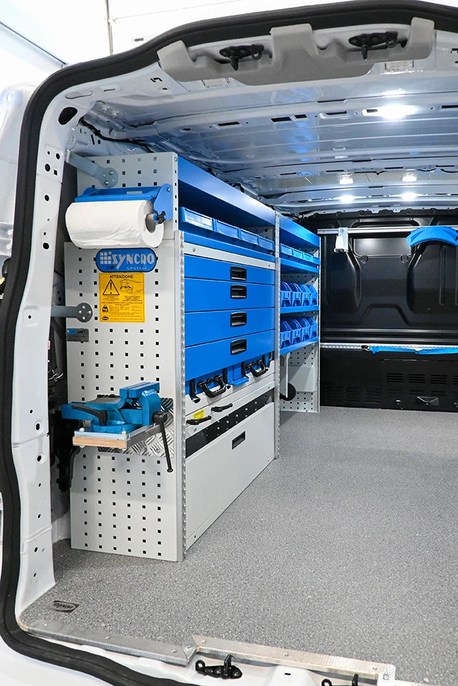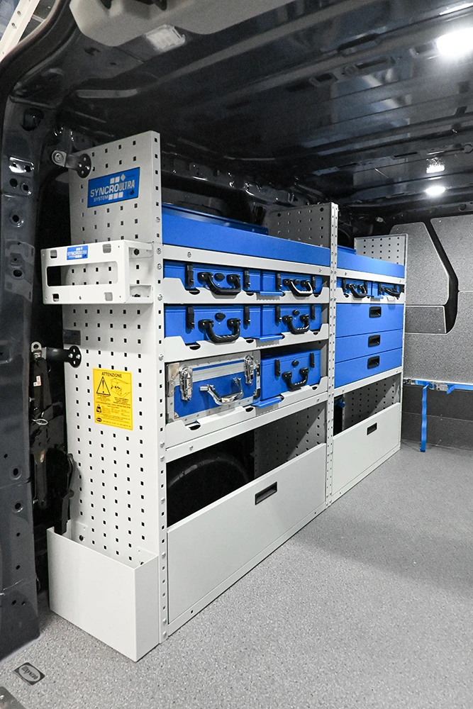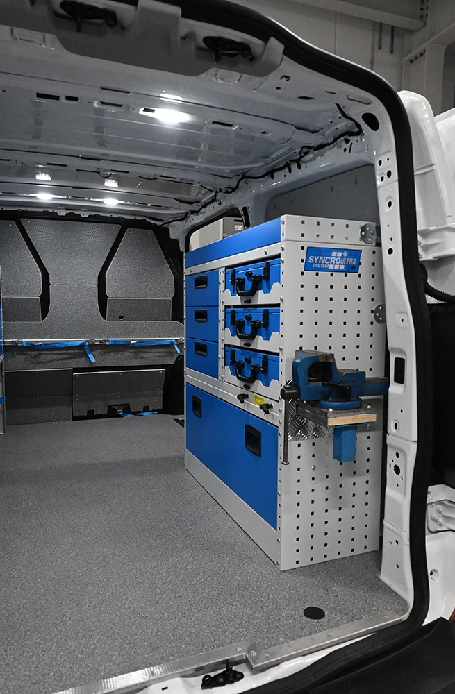 Volumul de stocare este relativ mare considerand dimensiunile furgonetei iar forma acesteia acomodeaza bine echipamentele Syncro.