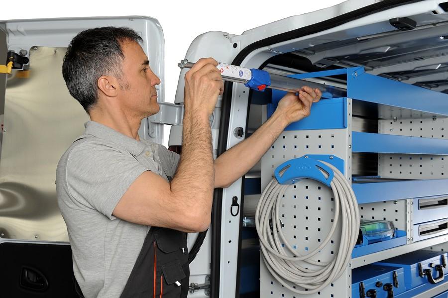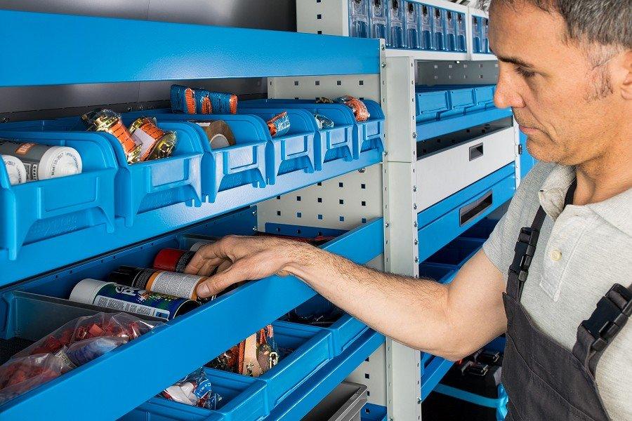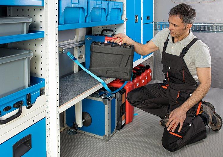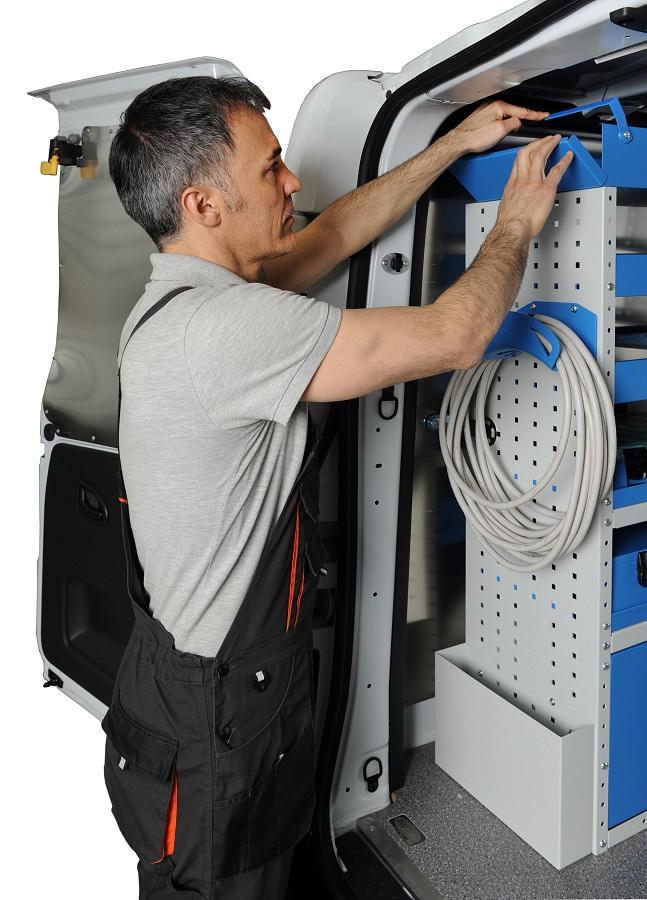 separatoare de spatiu din aluminiu (intre 0 si 12 in functie de latimea raftului), impreuna cu cleme din plastic Vibrastop care elimina vibratiile atunci cand autoutilitara este in miscare. Separatoarele pot fi montate, mutate si indepartate cu usurinta pentru a configura raftul in functie de nevoie.